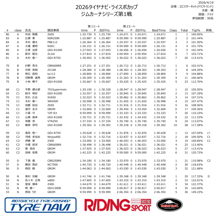 2026年モトジムカーナ大会第1戦のリザルト(2026/4/19)